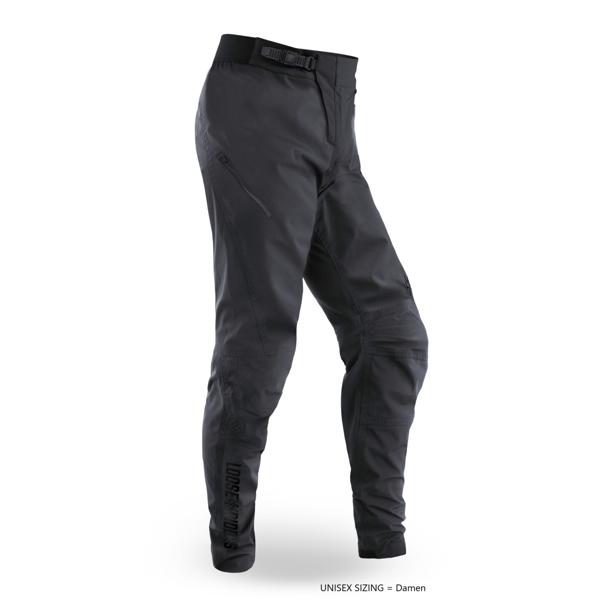The C/S WEATHERPROOF PANTS by LOOSE RIDERS are highly water-repellent all-weather trousers from the C/S Black Label collection that will have you rocking the trail even in adverse conditions. The unisex MTB trousers come with the proven ratchet buckle and elasticated waistband. An extra ribbed yoke has been added for even more freedom of movement. A large thigh pocket with a water-repellent zip offers space for your essentials, while a zip pocket at hip height on the right-hand side keeps your lift pass safe. Comfort meets style with these mountain bike trousers and gives you an effortless look on the trail without restricting your movement. The fit of the trousers allows for wearing knee pads.